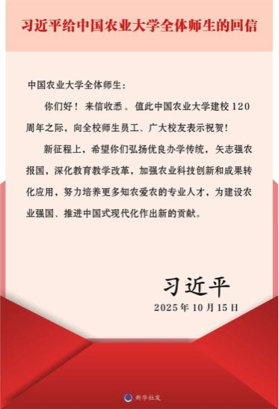 2025级本科生李壮壮表示:“习近平总书记在回信中希望中国农大师生弘扬优良办学传统,矢志强农报国。作为一名大一学生,我深受鼓舞。这让我明白,大学时光不仅要专注于知识学习,更要将个人成长与国家发展紧密相连。我要牢记总书记的嘱托,厚植爱农情怀,努力学习专业知识,积极参加实践活动,为将来投身农业强国建设打下坚实基础,用青春和汗水在广袤田野上书写精彩篇章。”(作者:关利平 审核:王磊)