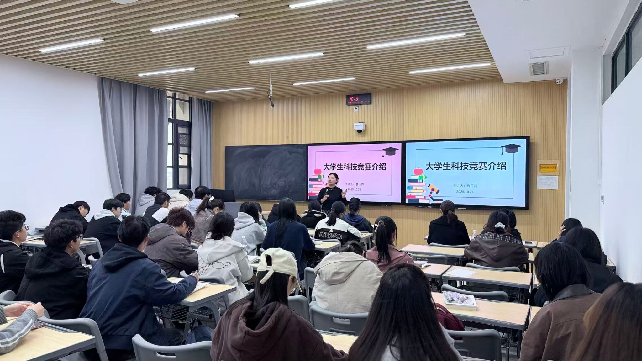 在成果分享之后,曹玉辉系统解读了“挑战杯”全国大学生课外学术科技作品竞赛、中国大学生创业计划竞赛、中国国际大学生创新创业大赛、全国大学生生命科学竞赛等竞赛体系架构,为学生搭建起脉络清晰的创新实践阶梯。紧紧围绕四个竞赛特点、参赛流程与能力要求展开深入解析。同时明确表示学院将为优质参赛项目提供从选题指导到成果打磨的全方位保障支持。并叮嘱学生们,首先要精准锚定竞赛各时间节点,将其作为首要任务,同时严格恪守所有参赛规则,确保备赛合规有序;其次选题要紧密立足学科前沿动态,深度结合专业特色,打造差异化优势,构筑核心竞争力;再次团队组建要打破单一学科壁垒,组建能力互补、结构多元的跨学科团队,实现1+1>2的协作效果;最后在备赛过程中要强化高效沟通,主动钻研竞赛规律与评分逻辑,围绕既定目标集中发力。期待大家在竞赛中不仅能斩获佳绩,更能充分展现我们的学术底蕴与学子的青春风采。